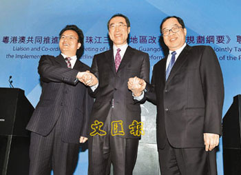 粵港澳三地政府19日在香港舉行共同推進實施《珠江三角洲地區(qū)改革發(fā)展規(guī)劃綱要》聯(lián)絡協(xié)調會議,唐英年、廣東省副省長萬慶良、澳門特區(qū)經濟財政司司長譚伯源率領三方官員,就如何落實《綱要》中有關粵港澳合作的部分,進行深入討論。中聯(lián)辦副主任郭莉也出席會議。