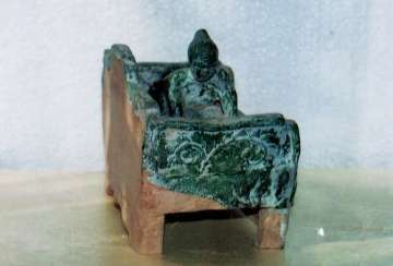 1、床:該床尺寸:長20.5cm,高:14cm,寬:12cm。從造型看漢代床的特征極為明顯。該床由三部分組成:床板,邊框,支架。該床為厚板與邊框護板相連。床面上刻有幾何形方格紋,又稱錢眼紋,泉源紋,即,古銅錢中心方孔紋飾。寓意睡臥錢眼,后輩有錢。床上邊框為左、后、右三面高護板組成。后護板中高、兩低。每塊護板上模印草花。寓意草繁茂盛。床板與邊框護板相連放在四腿支架上。四腿支架前后又有護板。前護板上三個方格內(nèi)有卷草模印圖案,后護板無釉無紋為黃泥土胎。