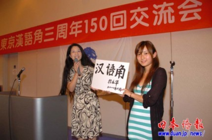 交流會(huì)上展示了中國(guó)駐日大使程永華揮毫題寫的“漢語角”3個(gè)大字,顯示了中國(guó)駐日大使館對(duì)中日民間交流的重視和對(duì)舉辦漢語角的支持。