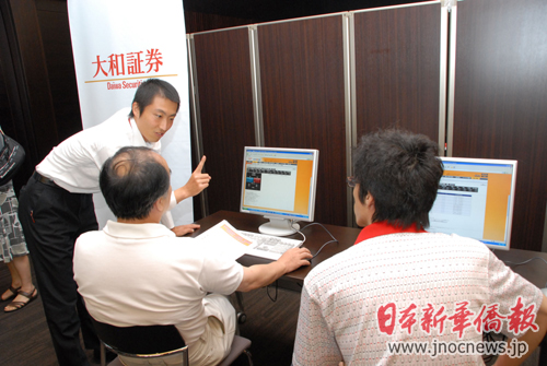 記者在會場上還看見,大和證券為了舉辦此次說明會,準備工作可謂面面俱到。考慮到中午時間,天氣炎熱,參加說明會的在日華人可能來不及吃午飯,大和證券就特意為大家準備了豐盛的盒飯和就餐時間;為了讓參會者對外匯實際操作有一個實際感覺,大和證券在會場一側設置了數臺電腦和最新款式的iPad平板電腦供大家模擬操作,遇到疑難問題,大和證券的員工們給予熱心仔細地解說。