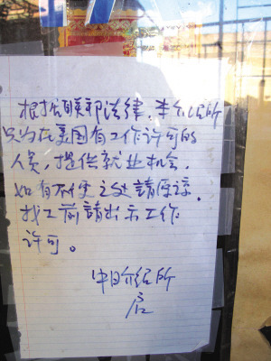報(bào)道指出,在7日執(zhí)法行動(dòng)中有一名石姓女子被捕的中日職業(yè)介紹所仍繼續(xù)關(guān)門,8日一早門上就張貼出中英文告示,明確告訴找工者必須有工作許可證。