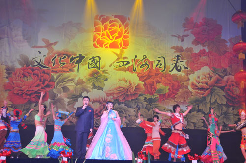 演出前,藝術(shù)團(tuán)團(tuán)長、國務(wù)院僑辦副主任趙陽發(fā)表了熱情洋溢的講話。他代表國務(wù)院僑辦和李海峰主任向旅居澳大利亞的廣大僑胞和現(xiàn)場觀眾致以新春的祝福。趙陽指出,剛剛過去的2009年,是新中國成立60周年,60年來中國所取得的巨大成就離不開海外僑胞的關(guān)心和支持!拔幕袊 四海同春”藝術(shù)團(tuán)為大家?guī)砹俗鎳H人的親切問候和美好祝愿。