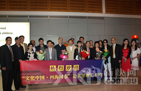趙陽(yáng)一行抵達(dá)悉尼后,受到胡山總領(lǐng)事等的熱情歡迎,悉尼藝術(shù)界、僑界代表拉起橫幅,送上鮮花,熱情歡迎到悉尼作慰問(wèn)演出的藝術(shù)團(tuán)一行。