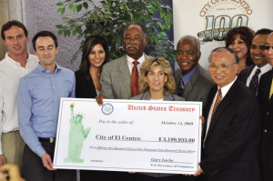 中新網(wǎng)10月16日電 據(jù)美國《僑報》報道,美國經(jīng)濟蕭條還沒有走出低谷,聯(lián)邦財政預(yù)算捉襟見肘。14日在帝王郡艾爾森特市政府(El Centro, Imperial County)舉行頒獎典禮,聯(lián)邦商務(wù)部經(jīng)濟發(fā)展局(EDA)表彰華裔開發(fā)商美國YK集團(YK America Group),對美國經(jīng)濟和創(chuàng)造就業(yè)的貢獻,并獎勵給他們由商務(wù)部長駱家輝簽名的320萬美元支票,用于商業(yè)開發(fā)區(qū)水電和道路的基礎(chǔ)建設(shè)。