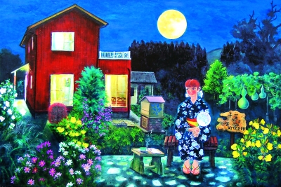 黑藍(lán)色的夜空,掛著冰鏡碧玉般的月亮,柔柔的月光下,一個(gè)穿著藍(lán)底白花夏日和服(浴衣)的日本女性,坐在院子里長(zhǎng)滿(mǎn)鮮花綠草的木桌旁,桌子上放著一封開(kāi)啟的信件,她的眼神是寂寞、憂(yōu)傷,是祈念、期待。她在等待誰(shuí)?又在祝福誰(shuí)?畫(huà)的題目是“但愿人長(zhǎng)久”。