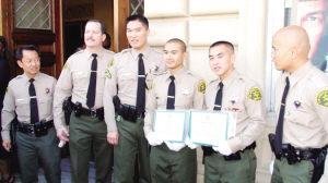 上午10點畢業(yè)典禮開始,洛縣警局局長李貝卡親自為70名新警員頒發(fā)畢業(yè)證書,在這些人當(dāng)中,有4人是亞裔,其中包括一名韓裔、一名越裔和兩名華裔,這兩人分別是26歲的何青源和25歲的陳得光。兩人在家人和朋友的簇擁下顯得格外的自豪,并在洛縣警局華裔警官何思棋的陪同下一起合影留念。