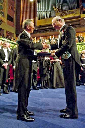頒獎(jiǎng)當(dāng)天共有8人上臺(tái)領(lǐng)獎(jiǎng),高錕被安排在第一個(gè)。瑞典國王卡爾十六世—古斯塔夫破格走向高錕站立處為他頒獎(jiǎng),彼此親切握手致意。高錕從容自若,滿臉笑容從瑞典國王手中接過諾貝爾物理獎(jiǎng)狀,場面相當(dāng)溫馨。