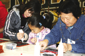 副會(huì)長(zhǎng)鹿強(qiáng)當(dāng)天全家上陣,包括岳父岳母和妻子兒女在內(nèi)的一家六口全都來(lái)到了粘花現(xiàn)場(chǎng),一起為世博會(huì)花車中國(guó)館模型粘貼由紅豆和黑豆組成的吉祥圖案,岳父方先生一邊干活一邊表示,能為世博會(huì)花車出一份力,這是他們?nèi)业淖院馈?/p>