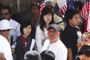 記者站在游行指揮前導(dǎo)車(chē)上望眼欲穿地在人海中搜索著華人的蹤影,總算在5街路口的人行道上看到了兩個(gè)埋沒(méi)在人海中的華裔女孩。但據(jù)兩人的自我介紹,她們是南加大的學(xué)生,是出來(lái)進(jìn)行測(cè)繪的,和這場(chǎng)大游行毫不相干,只是趕上了,就站在路邊看個(gè)熱鬧而已。(高睿)