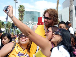 盡管活動是11時才開始,盡管當天是周一上班日,但上午8時不到,洛杉磯市中心已經(jīng)擠滿來看游行的熱情球迷,街上一片紫金潮(湖人隊象征顏色),相當繽紛亮麗。