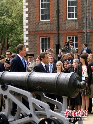 在英國BBC舊址,薩科齊和夫人布呂尼在卡梅倫和英國查爾斯王子的陪同下,為一座戴高樂紀(jì)念碑揭幕。在卡林頓園林,薩科奇向戴高樂和丘吉爾的雕像獻花。
