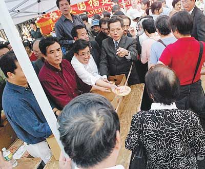 中新網(wǎng)9月23日電 據(jù)美國(guó)《世界日?qǐng)?bào)》報(bào)道,今年的農(nóng)歷中秋佳節(jié)落在10月3日,美國(guó)福建同鄉(xiāng)會(huì)21日與20多個(gè)社團(tuán)和政府部門在紐約曼哈頓華埠舉行盛大的“中秋福建街坊節(jié)”,吸引超過5000民眾參加,其中大部分為閩籍鄉(xiāng)親,也有不少非華裔民眾湊熱鬧。福建同鄉(xiāng)會(huì)并在下午為鄉(xiāng)親派發(fā)福建的傳統(tǒng)月餅,共派出1500多份,眾多鄉(xiāng)親開心排隊(duì)領(lǐng)取。