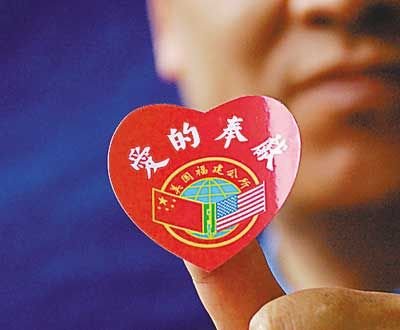 福建公所主席鄭時(shí)甘在東百老匯的募捐攤位上向每位捐款的民眾贈(zèng)送一張印有“愛的奉獻(xiàn)”字樣和福建公所標(biāo)志的紅色心型貼紙,一方面表示對(duì)捐款者的感謝,一方面希望僑胞能將貼紙傳遞給更多華人,使更多民眾為青海災(zāi)區(qū)獻(xiàn)上愛心。