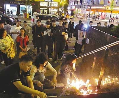 網(wǎng)友們在圖書館前的臺階前擺上大大小小的蠟燭,還有人從網(wǎng)站上下載了姚姓女留學(xué)生的照片,放在旁邊,并打印了一些悼念的話貼在圖書館門前,對她的離去表示悲痛,希望小區(qū)可以提高警惕,嚴(yán)防罪犯,同時人與人之間能互相關(guān)愛,不要對受害者“視若無睹”。