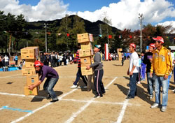 6名中國研修生組成的團隊每個人身背5個紙箱,與當?shù)厝毡敬迕癖荣愗撝馗傋。開始的時候,他們年輕力壯走在前面,但當?shù)卮迕駪{借著早已掌握這項傳統(tǒng)比賽的技巧后來居上,最終拔得頭籌。競走途中,村民們?yōu)樗麄兏吆啊凹佑汀,氣氛非常熱鬧。