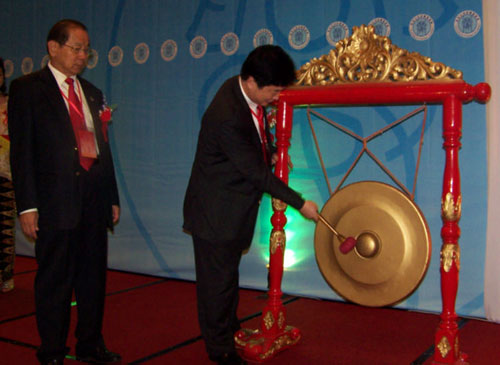 雅加達(dá)興安會(huì)館會(huì)長(zhǎng)關(guān)文龍帶領(lǐng)中共莆田市委書記楊根生上臺(tái)為今次第五屆世界興安同鄉(xiāng)懇親大會(huì)暨第五屆世界莆商大會(huì)鳴鑼示意,宣布大會(huì)的正式開始。