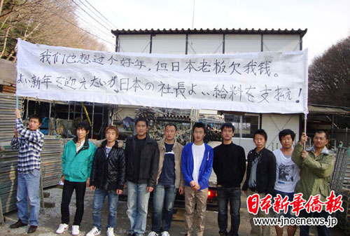 中新網(wǎng)12月31日電 據(jù)日本新華僑報網(wǎng)報道,“我們也想過個好年,但日本老板欠我的錢!”12月30日上午,十名來自東北的在日中國實(shí)習(xí)生在他們的住地前打出雙語橫幅,憤怒譴責(zé)他們所在的“健陽”株式會社的日本老板拖欠工資的行為。