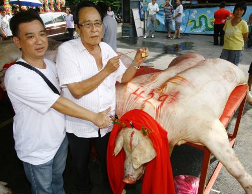 他說,由于早前附近都是從事養(yǎng)豬業(yè),生豬大賽旨在聯(lián)誼居民,讓大家促進(jìn)交情。祭拜儀式完畢后,所有的生豬將全數(shù)切割分發(fā)給民眾。