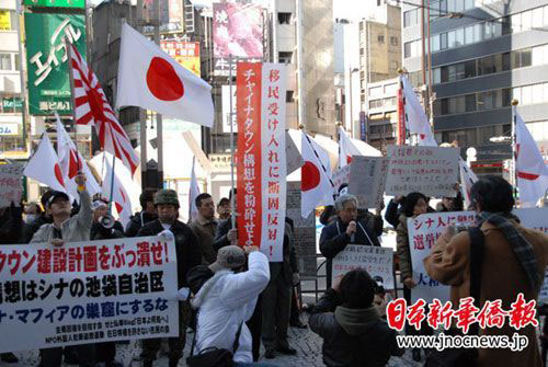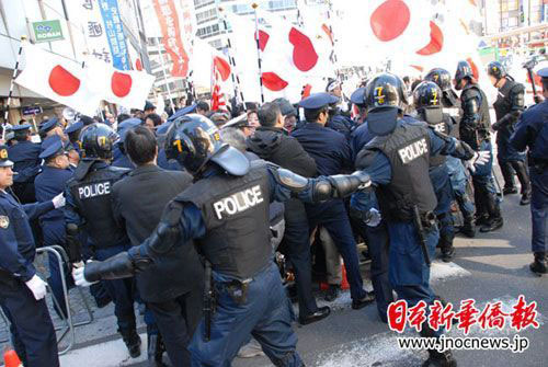 面對(duì)右翼分子的叫囂,“陽光城”的華人員工顯得非常沉著冷靜,依然熱情接待來到這里的每一位客人。在現(xiàn)場(chǎng),日本警方也積極維護(hù)華人不受傷害。右翼分子在講演中攻擊中國留學(xué)生,一位中國女留學(xué)生勇敢地站出來,大聲說:“我是中國人,是中國留學(xué)生,你們都是‘右翼垃圾’!”當(dāng)右翼分子要對(duì)這名女學(xué)生動(dòng)手時(shí),警員立即沖過來加以保護(hù)。