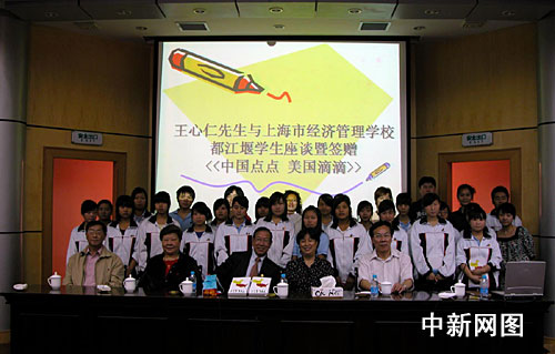 今天的贈書儀式上,王心仁先生與大家分享了他的人生經(jīng)驗。當(dāng)了解到去年汶川大地震后上海市經(jīng)濟(jì)管理學(xué)校接收了近70名來自上海對口支援地區(qū)四川都江堰的學(xué)生時,王心仁先生勉勵這些遠(yuǎn)離家鄉(xiāng)的同學(xué)能夠珍惜學(xué)習(xí)機(jī)會,并向這些學(xué)生每人送上了一張上海交通卡,希望他們多多了解這個城市。