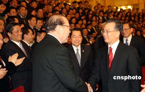 1月16日,中國國務(wù)院總理溫家寶在北京人民大會(huì)堂接見中國僑商企業(yè)投資協(xié)會(huì)全體代表,并發(fā)表講話。中國僑商投資企業(yè)協(xié)會(huì)首屆會(huì)員代表大會(huì)1月15日上午在北京舉行。該協(xié)會(huì)是在上世紀(jì)90年代以來已陸續(xù)成立了31個(gè)地方僑商組織的背景下首創(chuàng)的全國性僑商組織。(中新社/盛佳鵬 攝)