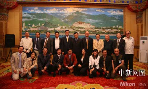 圖為張慶黎與訪(fǎng)藏海外華文媒體代表團(tuán)全體合影。賈長(zhǎng)飛 攝影
