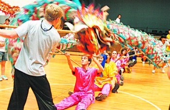 鑼鼓聲中,湖南涉外經(jīng)濟(jì)學(xué)院舞龍舞獅隊(duì)千變?nèi)f化的動(dòng)作,讓美國(guó)學(xué)生感到震撼,也不忘嘗試一番中國(guó)龍的韻味。而南棍和太極等中國(guó)功夫更讓美國(guó)學(xué)生興致高漲。期間,美國(guó)學(xué)生擺弄起中國(guó)的筆墨紙硯,還真是有模有樣。