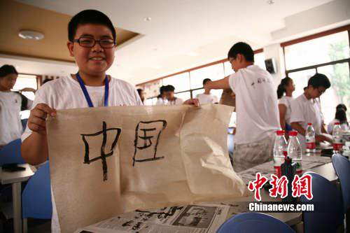 中新網(wǎng)成都7月30日電 (徐楊祎 張浪)30日上午,170多位參加“2010中國尋根之旅”夏令營四川營的海外華裔少年,來到位于四川大學的書法教室,學習中國書法。