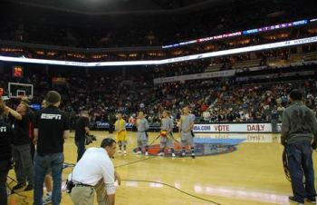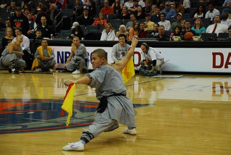 中場休息期間在全場觀眾經(jīng)久不息地助威聲下,費(fèi)佛爾大學(xué)孔子學(xué)院邀請(qǐng)的4位功夫大師由愛美麗·羅德女士率領(lǐng)步入球場中央,功夫大師們恭謹(jǐn)?shù)叵蛉珗鲇^眾行佛禮。這時(shí)賽場主持人以NBA式的渾厚嗓音向現(xiàn)場觀眾發(fā)布: “讓我們熱烈歡迎今晚的特別嘉賓,費(fèi)佛爾大學(xué)孔子學(xué)院少林功夫大師,他們給我們帶來了擁有1700年歷史的中國地道的少林功夫!