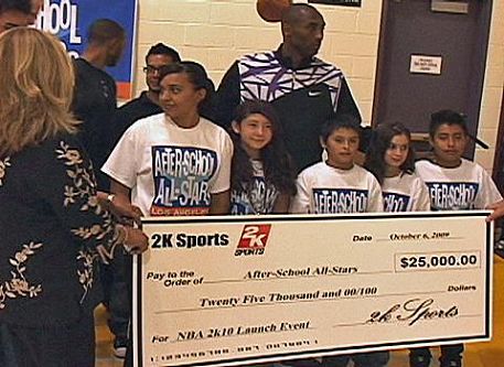 在洛杉磯的一個(gè)叫做《大家都是大明星課后輔導(dǎo)項(xiàng)目》的捐款儀式上,科比主持籃球電子游戲比賽,讓他的湖人隊(duì)同伴以及快艇隊(duì)的兩個(gè)球員戈登和卡曼大戰(zhàn)中學(xué)生,在游戲?qū)购,布萊恩特把一張兩萬五千美元的支票,捐給了洛杉磯輔導(dǎo)項(xiàng)目的執(zhí)行長(zhǎng)坎波斯。