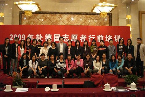 國家漢辦12日為該批志愿者組織了行前培訓并為他們送行。志愿者中心主任薛華領(lǐng)勉勵志愿者們繼承漢語教師志愿者兢兢業(yè)業(yè)、克己奉獻的優(yōu)良作風,發(fā)揚志愿精神,高標準要求自己,做好志愿服務(wù)工作。同時也希望志愿者們牢記漢語教師志愿者的“光榮感、責任感、使命感”,進一步提高自身素質(zhì),關(guān)心國家大事,在新中國60華誕之際,抓住機遇,展示祖國的偉大成就,為中德友好交流做出貢獻。志愿者們紛紛表示,祖國的崛起與富強堅定了他們當好文化傳播民間使者的信心和決心,激勵著他們投身到漢語國際推廣事業(yè)的最前沿隊伍中去,把工作做得更好、更精彩。