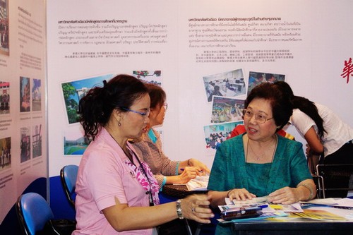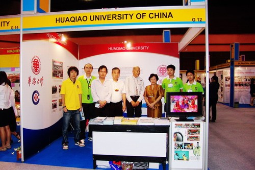 駐泰國代表處精心布置的展位醒目、美觀,電視播放的華僑大學(xué)美麗的校園畫面吸引了許多參觀者駐足觀看。同時(shí)代表處每天還安排校友及學(xué)校在泰國的教師志愿者等協(xié)助工作,他們通過自身學(xué)習(xí)經(jīng)歷,以中、泰、英三種語言,詳細(xì)介紹華僑大學(xué)和華文學(xué)院的情況。