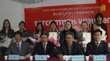 中新網(wǎng)5月26日電 據(jù)國(guó)家漢辦網(wǎng)站消息,5月21日,蒙古國(guó)立大學(xué)孔子學(xué)院隆重舉行了春季學(xué)期結(jié)業(yè)典禮。院長(zhǎng)于健、副院長(zhǎng)其米德策耶、院長(zhǎng)助理朱軍利及專(zhuān)家教師烏蘭哈達(dá)出席了結(jié)業(yè)典禮。