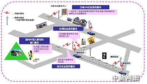 本系統(tǒng)考慮了信息通信基礎(chǔ)設(shè)施不十分完備的旅游觀光地的地域特性,在無(wú)線基站沒(méi)有聯(lián)網(wǎng)的情況下,也能靈活運(yùn)用以車輛間通信技術(shù)為基礎(chǔ)的“車輛傳輸信息,以及車輛間直接構(gòu)成網(wǎng)絡(luò)”功能,提供:①當(dāng)?shù)豑PO信息提供服務(wù);②傳聞信息提供服務(wù);③堵車信息提供服務(wù);④面向外國(guó)人旅游觀光客的向?qū)Х⻊?wù)等與旅游司機(jī)需求相匹配的信息。