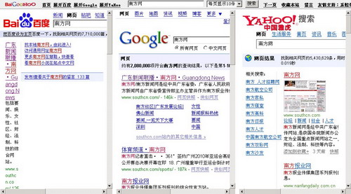 看到這個頁面,你一定會覺得很“雷”吧!還有更“雷”的在后面,為驗證搜索效果,記者嘗試輸入“南方網(wǎng)”進去搜索,發(fā)現(xiàn)搜索出來的結(jié)果、頁面也是和百度、谷歌、雅虎一樣,只不過是把三大網(wǎng)站搜索結(jié)果進行了并列排放。