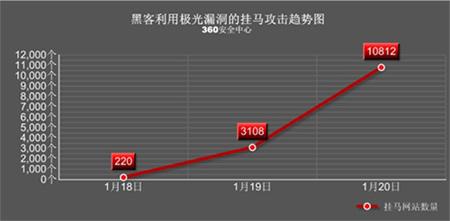 中新網(wǎng)1月21日電 IE瀏覽器新近曝出的“極光”0day漏洞正在引發(fā)空前迅猛的掛馬攻擊。來(lái)自360安全中心的監(jiān)控?cái)?shù)據(jù)顯示,1月18日至1月20日三天內(nèi),黑客利用該漏洞掛馬的網(wǎng)站數(shù)量從220家猛增到10812家,相關(guān)掛馬網(wǎng)頁(yè)數(shù)量更是高達(dá)141856個(gè)。