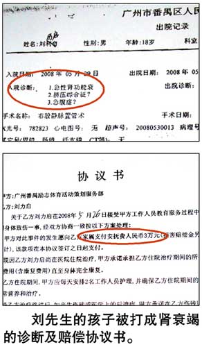 與楊先生同病相憐的還有東莞的劉先生,他的孩子在去年5月26日送進(jìn)一個(gè)訓(xùn)練營,訓(xùn)練期也是三個(gè)月,繳費(fèi)13100元,而30日孩子便被送進(jìn)醫(yī)院,經(jīng)醫(yī)生診斷為毆打、缺乏飲用水造成的腎衰竭。劉先生說,訓(xùn)練營的訓(xùn)練內(nèi)容“基本上沒有心理輔導(dǎo),只有少得可憐的法制教育,其余的全部都是‘生理輔導(dǎo)’和軍事訓(xùn)練”。