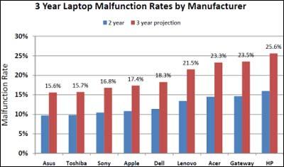 報告顯示,在三年時間內(nèi),華碩筆記本出現(xiàn)硬件故障的比例最低,僅為15.6%。東芝位居第二,故障率為15.7%。索尼第三,故障率為16.8%。蘋果第四,故障率為17.4%。戴爾第五,故障率為18.3%。聯(lián)想第六,故障率為21.5%。宏基第七,故障率為23.3%。Gaeway第八,故障率為23.5%;萜盏诰,故障率為25.6%。