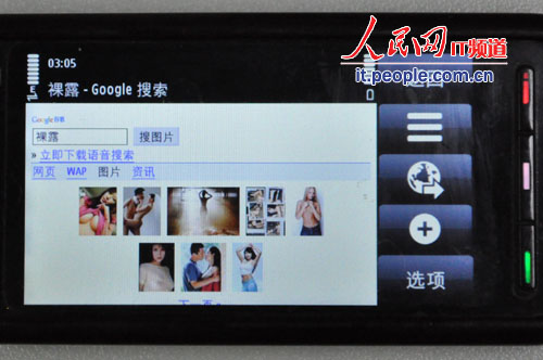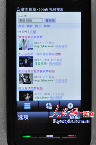 在搜索視頻內容時,輸入“激情 視頻”后,手機立刻顯示出許多帶有不堪入目圖片的鏈接,其中第一個便是名為“美女視頻美女艷舞”,谷歌在這次打擊手機色情行動中的反應可見一斑。