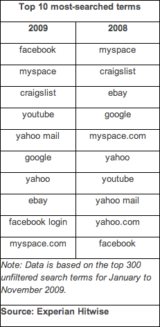 2008年,F(xiàn)acebook在該排行榜的排名僅為第10,而今年卻一舉超越去年的冠軍Myspace,成為最流行的搜索關鍵詞,Myspace退居第二。