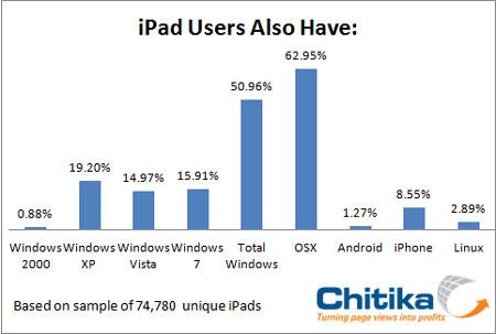 Chitika對7萬多名iPad用戶進行了調(diào)查,結(jié)果發(fā)現(xiàn)有50.96%的用戶使用Windows系統(tǒng)。當(dāng)然,使用Mac OS系統(tǒng)的iPad用戶略占上風(fēng),比例為62.95%(部分用戶使用雙系統(tǒng))!