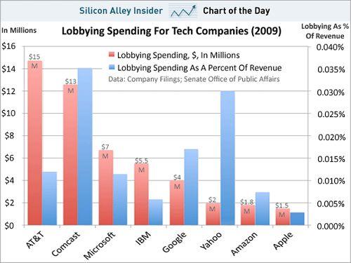 有趣的是,圖表顯示蘋(píng)果公司在游說(shuō)方面的花費(fèi)最少,可能與它沒(méi)有市場(chǎng)壟斷有關(guān)。