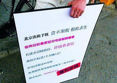 記者在論壇上看到,發(fā)帖的網(wǎng)友表示參照之前“強人”給她整理的手機賺錢指南,花費50元做了兩塊廣告牌便和妹妹一起出租手機開始創(chuàng)業(yè)。論壇帖子中還附帶了網(wǎng)友舉著廣告牌在北京的地鐵站做宣傳的圖片。廣告牌上寫著“北京出租收集,食不果腹,租機求生,使用目前最優(yōu)惠的套餐,長途市話隨便打,價錢看著給,我的目標是1個月賺5萬!打電話超過30分鐘,免費提供板凳和按摩服務(我穿短裙)”。該名網(wǎng)友稱,“目前成本已經(jīng)掙回,滾滾大洋正在朝我們奔騰而來,大家還有什么高招趕快說”。昨日,記者曾嘗試撥打廣告牌上的聯(lián)系方式與該網(wǎng)友聯(lián)系,但被告知為空號。