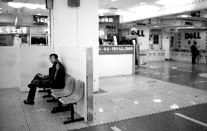 昨日,海龍大廈,一男子坐在一無(wú)人租賃的空鋪里休息。本報(bào)記者 浦峰 攝