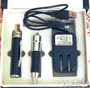 在談好280元的價格后,店主從柜臺的角落里拿出了一個上鎖的黑包,打開后從里面拿出了一個黑色的盒子,上寫英文“MP9 Digital Pocket Video Recorder”(MP9數(shù)字口袋攝像機)。整套產(chǎn)品由四部分構(gòu)成:筆頭、筆桿、充電器和USB線。該筆外形與一般的圓珠筆相差不大,其中筆桿為“偷拍筆”的核心部分,筆桿的頂端有一個開關(guān)按鈕,筆夾的上方有一個針眼攝像頭,筆桿背面有兩個小孔,上方小孔是指示燈,下方為收音孔。筆桿最下端有一個USB的接口,起到傳輸畫面的作用。據(jù)店主介紹,筆桿里面還有一個U盤存儲器,大小由2G到8G不等。