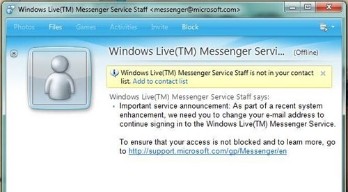 這個聲明稱,作為最近系統(tǒng)升級的一部分,我們需要你們修改你們的電子郵件地址以便繼續(xù)登錄Windows Live Messenger服務。為了保證你的訪問不被封鎖和了解更多的內(nèi)容,請訪問微軟技術(shù)支持網(wǎng)站/gp/Messenger/en。