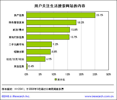 調(diào)查數(shù)據(jù)顯示,用戶感興趣的生活服務(wù)信息集中在四大類,其中美食占18.20%,旅游占15.83%,商家打折15.66%,房產(chǎn)25.09%,在房產(chǎn)信息中,出售房屋信息關(guān)注度最高,占到總整的6.4%,相對而言,其它類似家政、交友、招聘信息關(guān)注的程度較小。