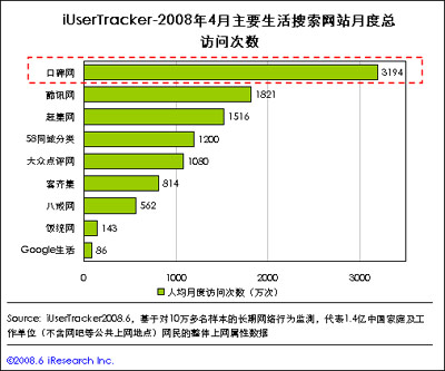 報告指出,經(jīng)過幾年的發(fā)展,國內(nèi)生活搜索發(fā)展的格局日趨明朗,口碑網(wǎng)、酷訊、趕集網(wǎng)等網(wǎng)站逐漸脫穎而出。其中,借助阿里巴巴集團強勁的資源優(yōu)勢,2004年成立的口碑網(wǎng)已發(fā)展成國內(nèi)最大的生活搜索網(wǎng)站。其用戶月度總訪問次數(shù)3194萬次,幾為第2位的酷訊網(wǎng)1821萬次和第3位趕集網(wǎng)1516萬次的總和。在人均月度訪問次數(shù)上,口碑網(wǎng)也以1.85次居榜首。
