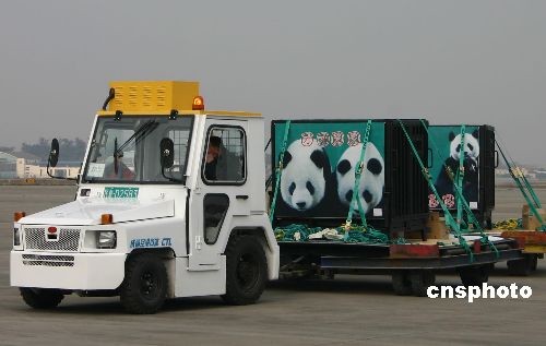 成都雙流國際機(jī)場工作人員運(yùn)送“團(tuán)團(tuán)”“圓圓”至“熊貓專機(jī)”登機(jī)處。