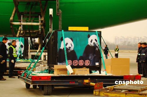 12月23日13時(shí)40分,成都雙流國際機(jī)場,工作人員正將贈(zèng)臺(tái)大熊貓“團(tuán)團(tuán)”“圓圓”運(yùn)上臺(tái)灣長榮航空公司的載運(yùn)專機(jī)。中新社發(fā) 霍潺 攝